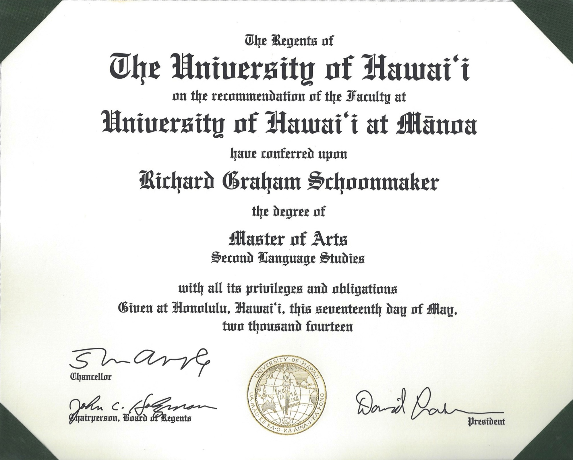 - M.A. in Second Language Studies, May 17th 2014